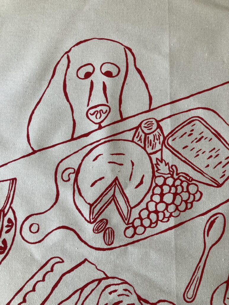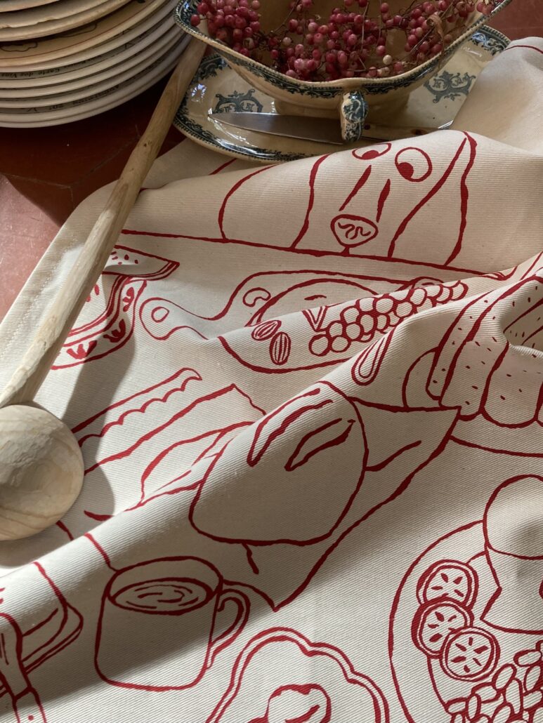 Quand c’est beau c’est bon ! Ce torchon est accompagné de la recette de La Charlotte aux fraises de Bobby d’après le dessin de Violette.